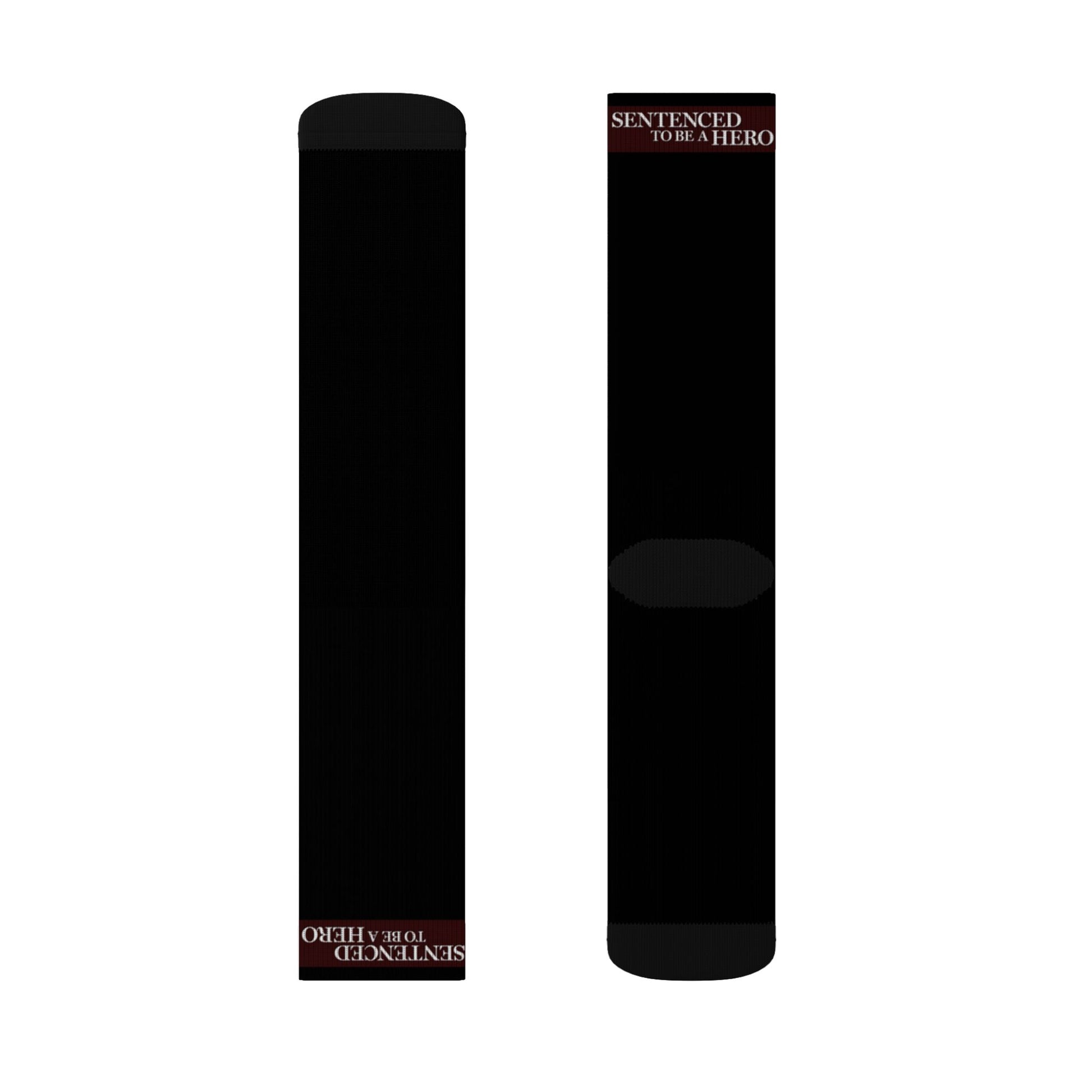 These Sentenced to Be a Hero anime socks feature the iconic logo from The Prison Records of Penal Hero Unit 9004, making them a must-have accessory for true fans of the series. The minimalist black design highlights the logo for a clean yet powerful anime streetwear look.